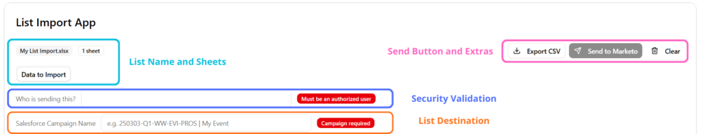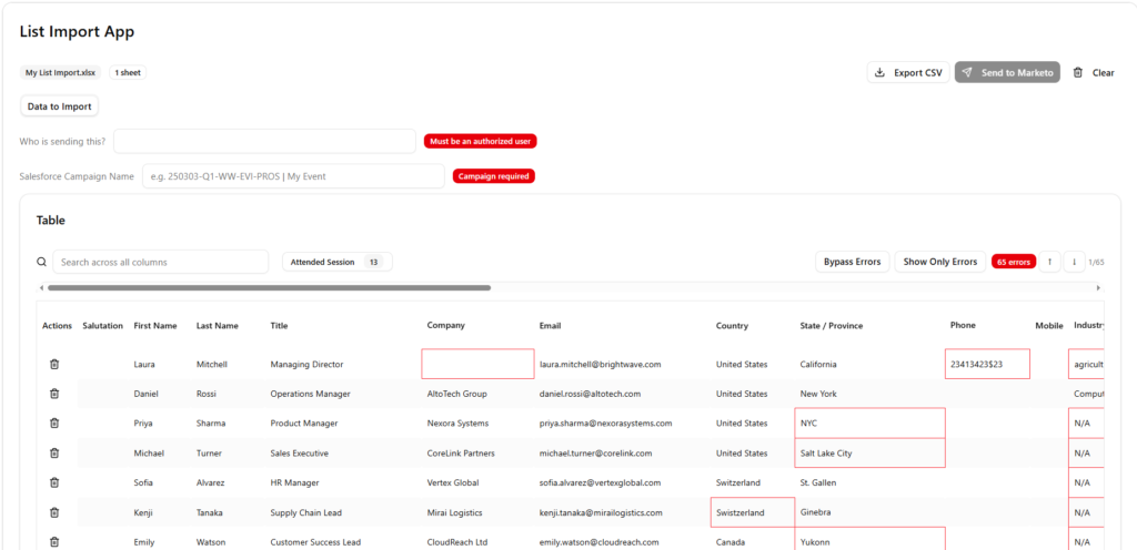 By default, the “Send to Marketo” button will be greyed out till there are no errors or the Bypass Errors button is active (more on that below).