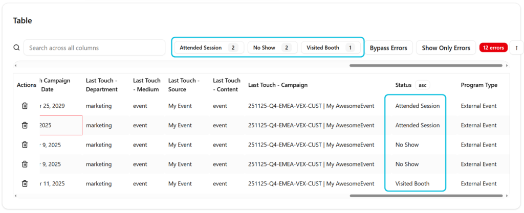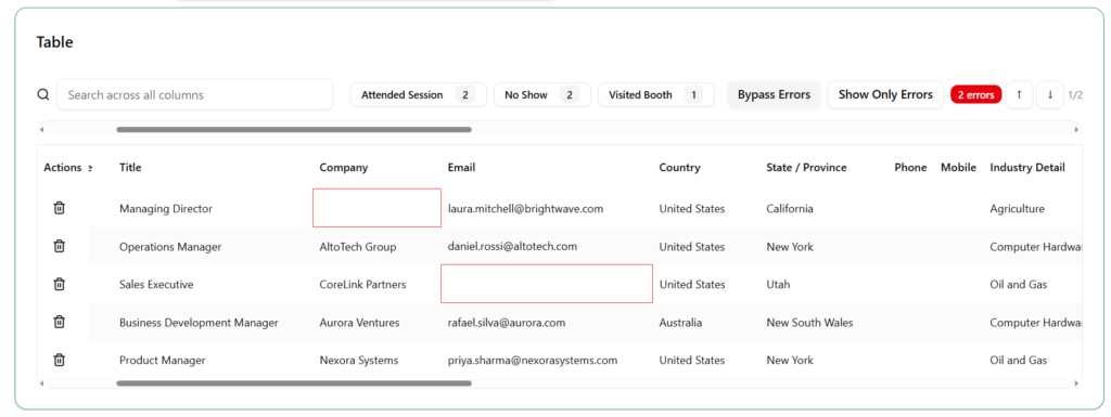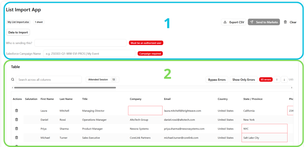 When the bypass errors button is clicked, the borders of the table turn green, indicating that the mode is active. In this state, the application allows sending the list to Marketo even if validation errors are still present.
