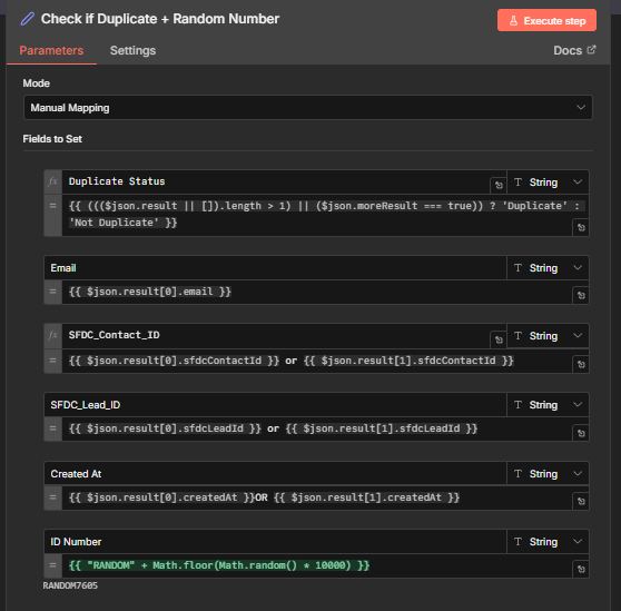 Inside the loop, we search for every lead by their email, and then extract their SFDC ID and Created Date. Additionally, in case the search outputs 2 items, the system will mark it as duplicate.