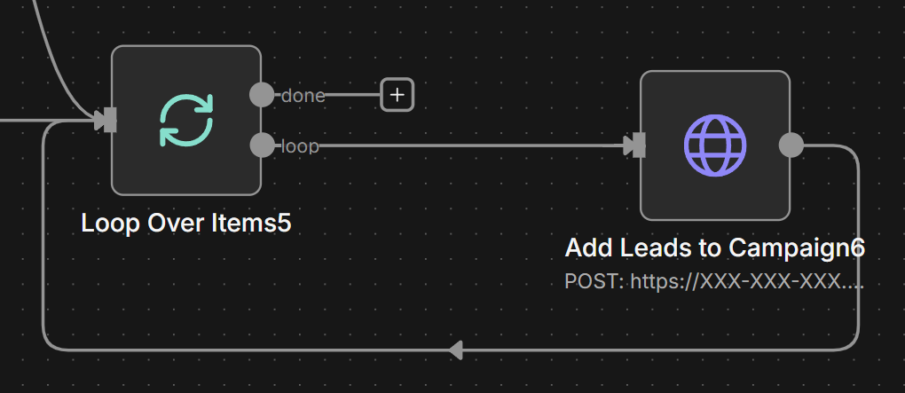The connection between the app and n8n is fairly simple as it’s a normal API Post request made from Vercel to the workflow. The whole table will be sent to n8n and appear as a JSON array in which we’ll need to split out the leads so each of them is processed individually.